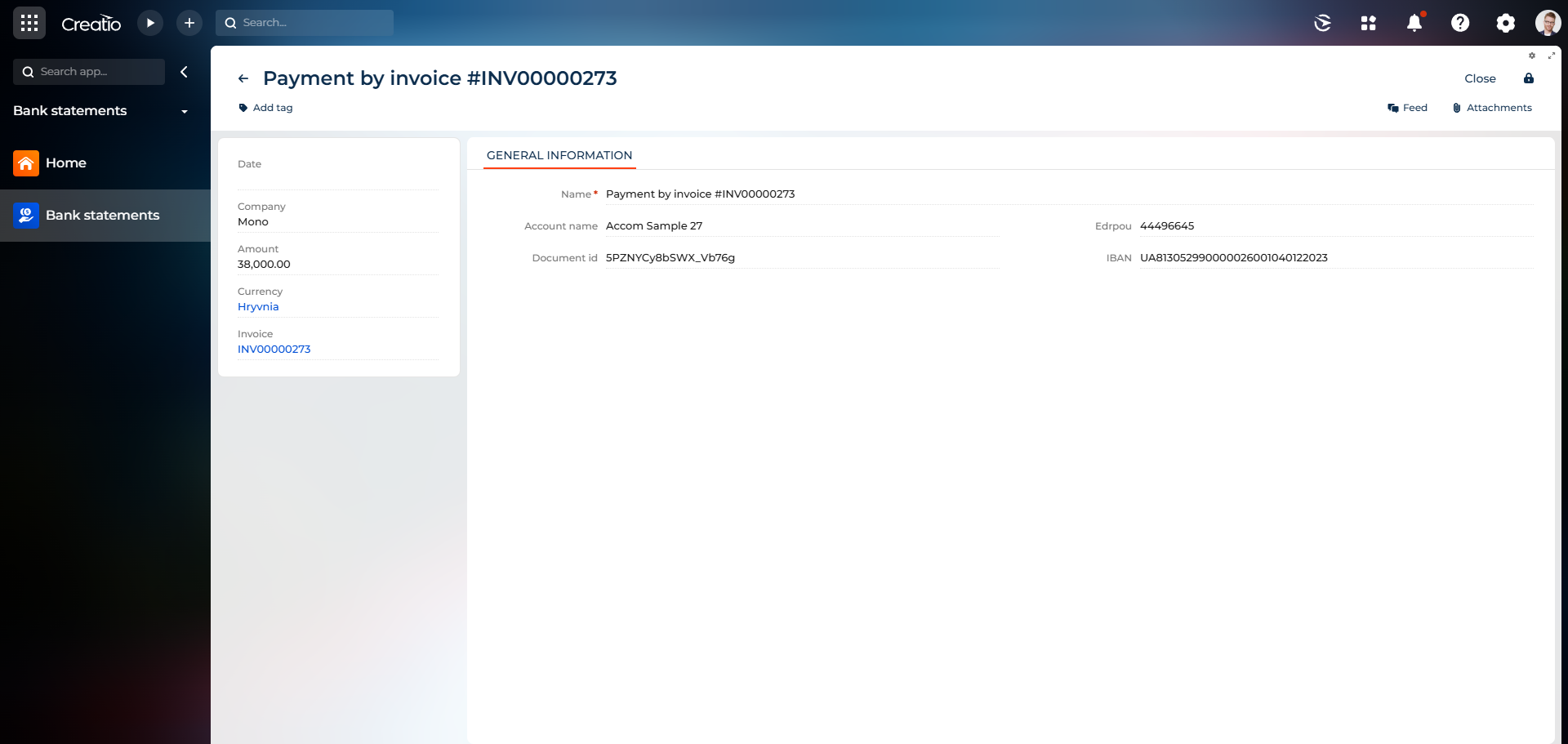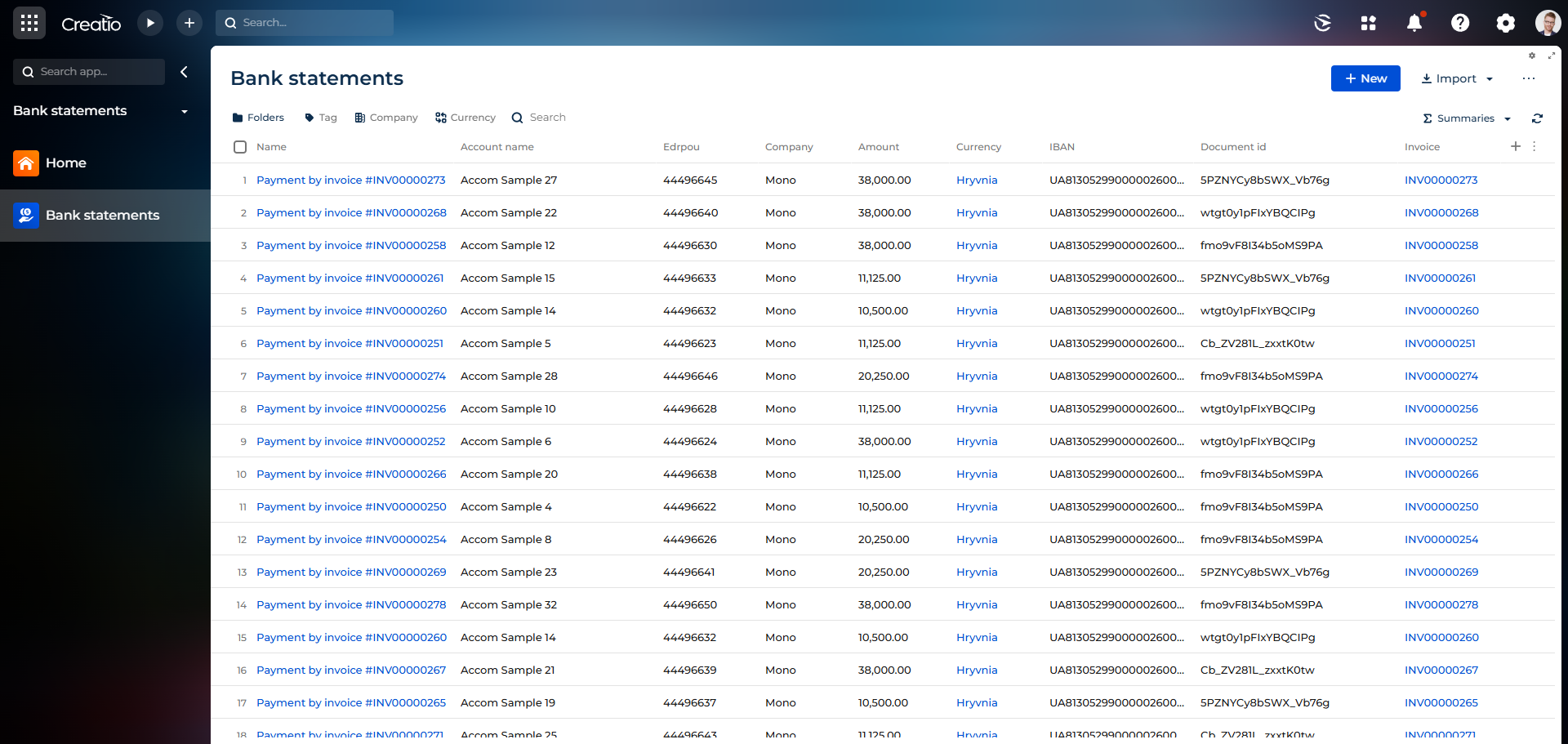 Importing bank statements for Creatio allows you to import statements from multiple accounts of legal entities that have bank accounts in PrivatBank, Monobank a FUIB. Uses: Using the solution, you can automatically: receive statements from the bank accounts of PrivatBank, Monobank and FUIB in Creatio. recognize the payment and set the status Paid by invoice.