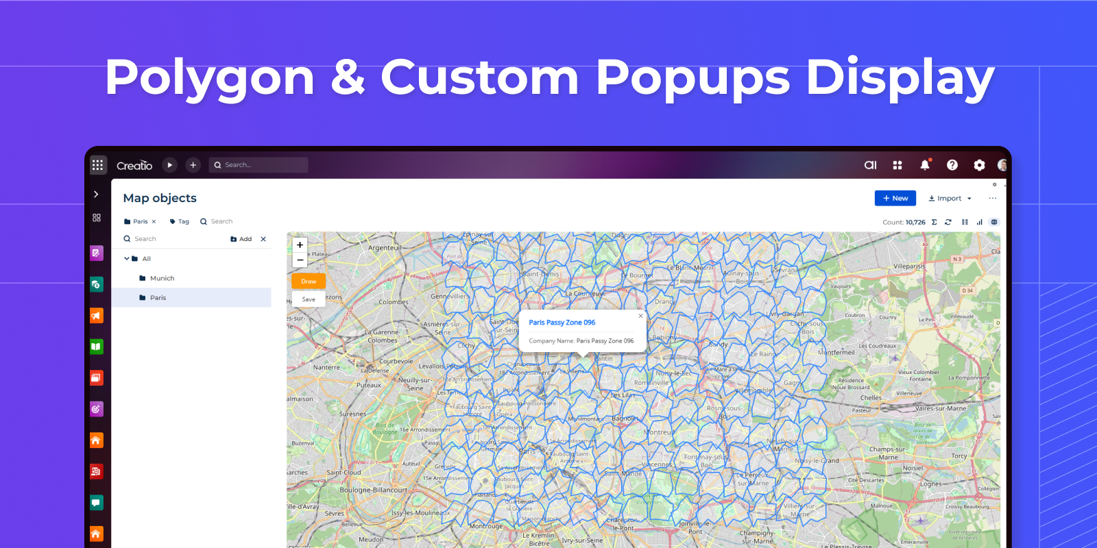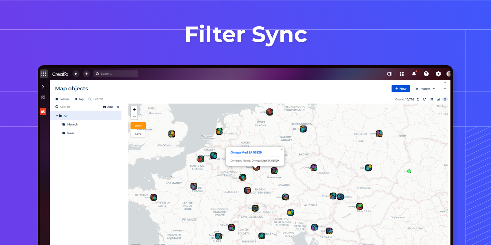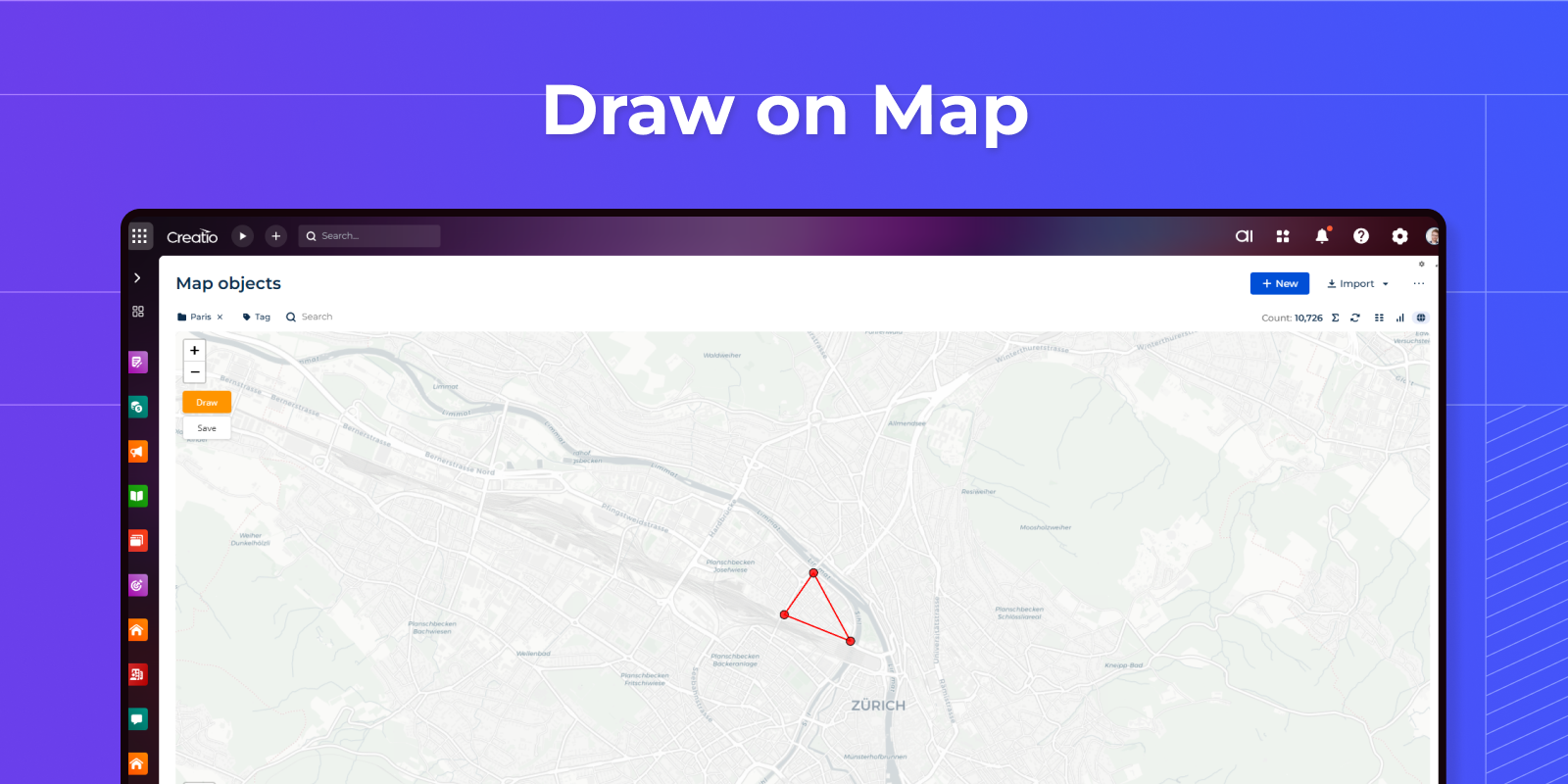An interactive map component for the Creatio Freedom interface that displays geographic data from entity diagrams, automatically geocodes addresses and integrates with business processes. Supports dot markers, polygons, multiple selection, drawing mode and real-time filtering.