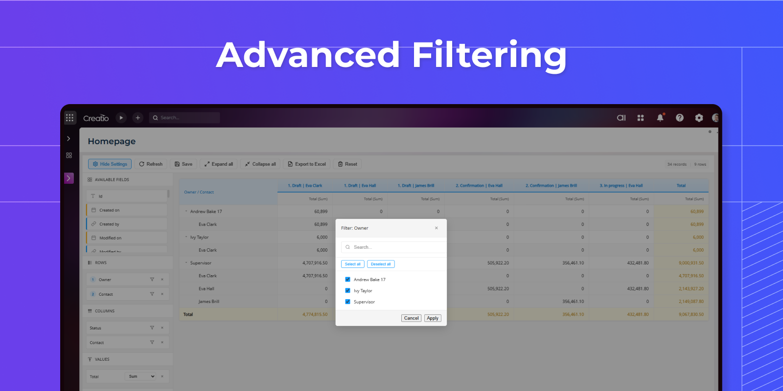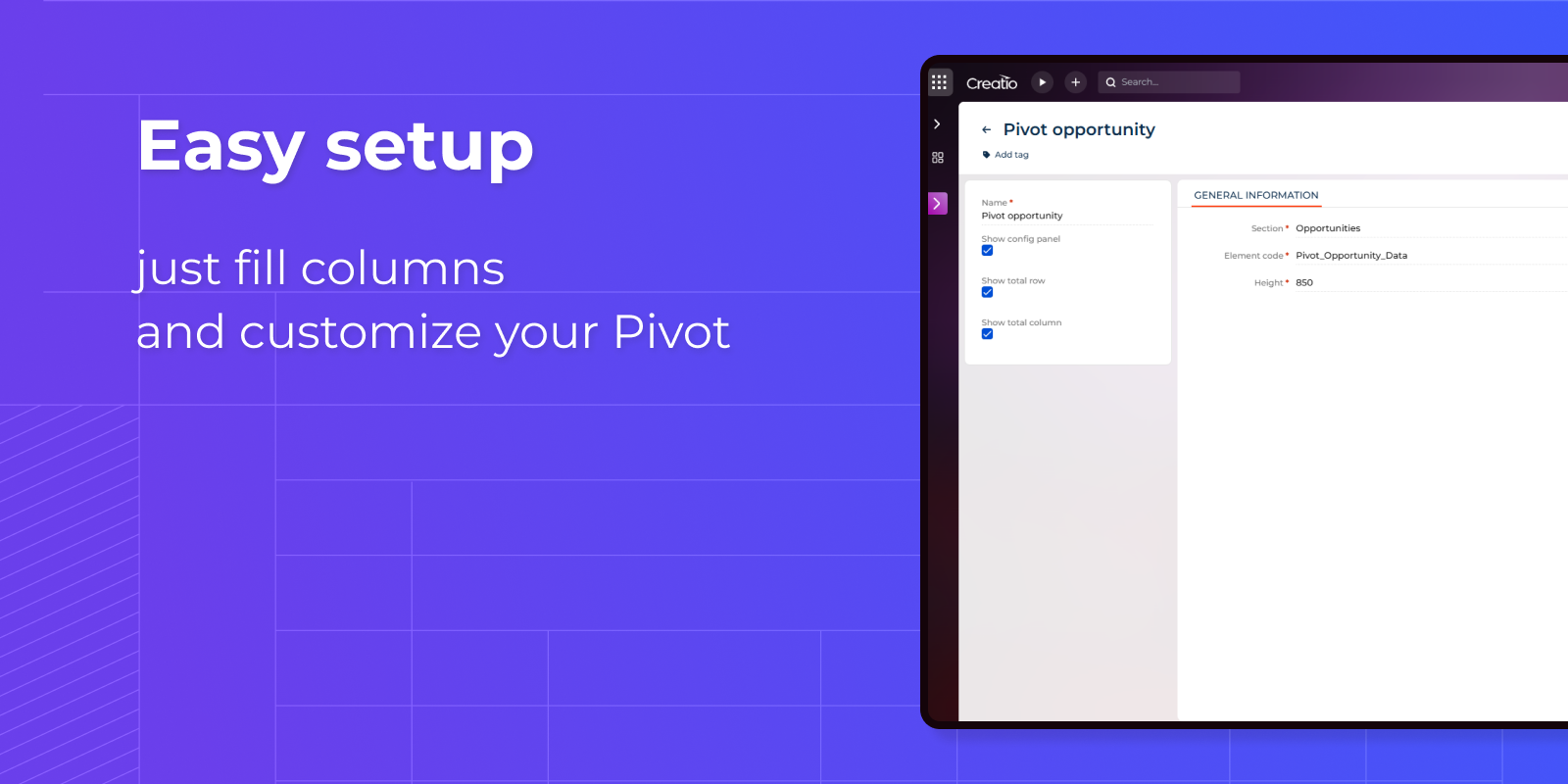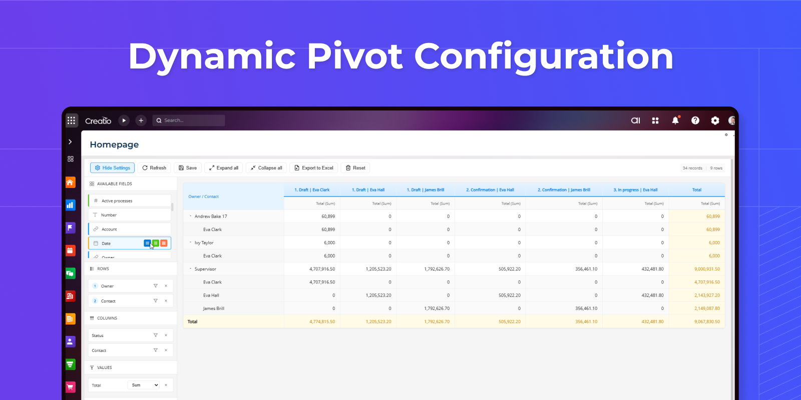 Syntech Pivot for Creatio adds pivot table functionality directly to Creatio. Users can create interactive pivot tables from any section (standard or custom), analyze data in real time, and create custom reports without developer involvement or export to spreadsheets.