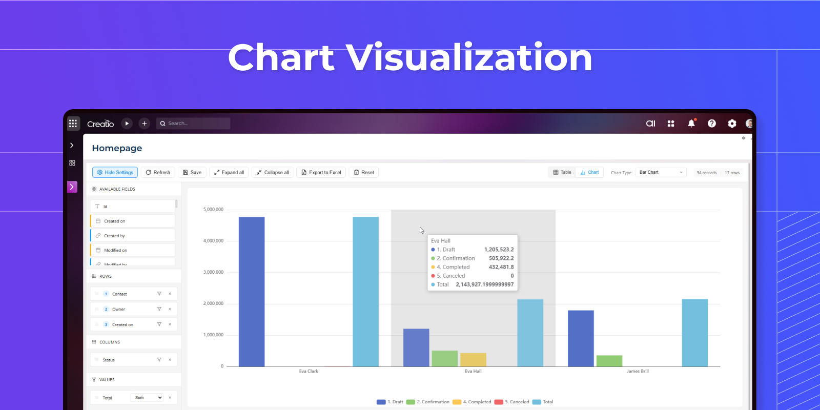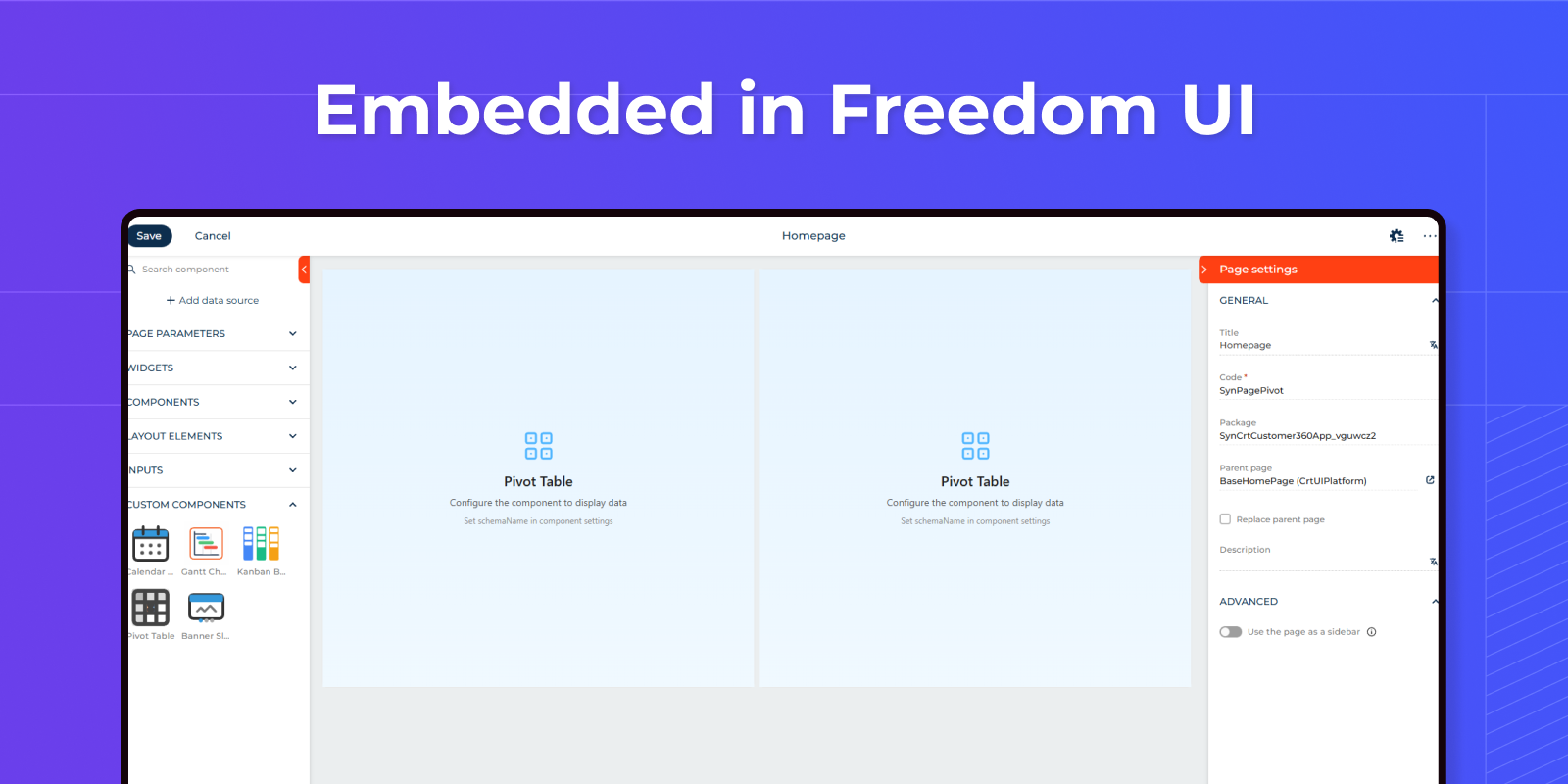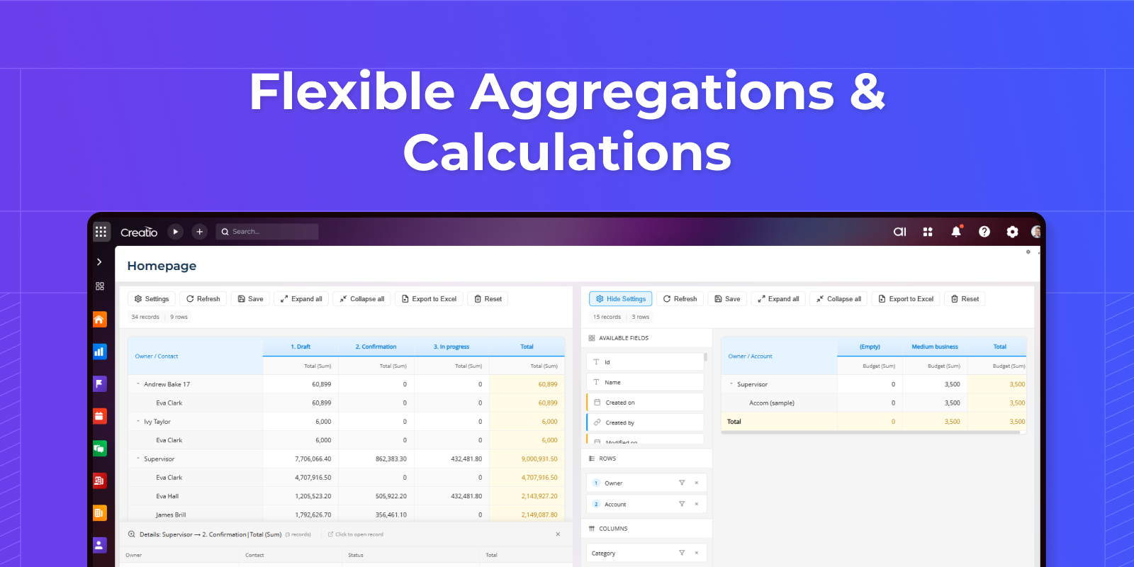 Syntech Pivot for Creatio adds pivot table functionality directly to Creatio. Users can create interactive pivot tables from any section (standard or custom), analyze data in real time, and create custom reports without developer involvement or export to spreadsheets.